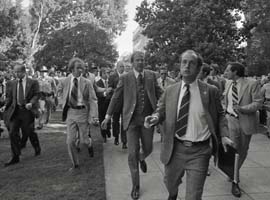 Patty Hearst, granddaughter of William Randolph Hearst, was kidnapped from her UC Berkeley off-campus apartment in early 1974. The Symbionese Liberation Army would later take credit for the abduction, and began brainwashing the hostage and coercing her to join their group. Hearst spent much of 1974 and 1975 partaking in bombings and robberies throughout California, until her arrest in September of 1975.