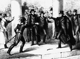 In the early 1830s, Andrew Jackson opposed the operation of the Second Bank of the United States on a national level, triggering a political struggle known as the "Bank War". Eventually Jackson's side won and the federal banking system was replaced by state banks. Richard Lawrence, mentally ill and delusional, thought that the US government owed him money for some reason, and that Andrew Jackson was preventing the money transfer by shutting down the national bank system. By killing Jackson, he would open the door for Martin Van Buren to become president, who would then repay him the money. On April 11th, Richard Lawrence was found not guilty by reason of insanity and sentenced to life in a mental institution. |