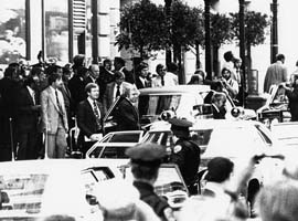 Many Americans felt sympathy for Hearst because they were convinced she had been forced to comply with the SLA demands to participate in the crimes. Others were impressed by the gangster lifestyle and political causes she espoused. One such admirer was Sara Jane Moore, a self-described revolutionary who had taken work at PIN, the People In Need organization, created by Randolph Hearst at the demand of the SLA, in hopes to get his daughter released. On September 25th, just three weeks after the failed assassination attempt by Lynette Fromme on president Ford, Moore decided to take her radical views to the next level, and kill the president. She hastily bought a handgun and waited in an assembled crowd waiting to watch Ford exit his hotel after giving a speech. Moore's first shot missed the target by a few inches, since she was unfamiliar with the weapon. She lined up for another shot but a bystander grabbed her arm and the discharged bullet went wide. She was subsequently mobbed by police officers and thrown in jail. In very similar fashion to the earlier assassination attempt, president Ford was rushed from the scene and continued his day without disruption. Sara Jane Moore was sentenced to life in prison and released in 2007. Patty Hearst was sentenced to 35 years in jail for her role in several robberies, but the sentence was commuted by Jimmy Carter just two years later. |